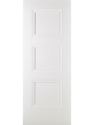 Traditional glazed internal white primed door with three square glass panels surrounded by rich, decorative mouldings. This door is available in a range of sizes and matching models are also available including solid FD30 fire door and a solid non-fire rated door.