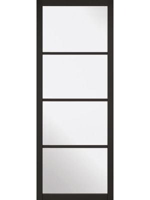 Complete door set (doors, demi panels and frame) - 35mm engineered non-fire rated glazed internal matt black doors with vertical and horizontal rails, matching demi panels and a matching matt black frame set. Clear toughened safety glass included in the doors and demi panels. Supplied fully finished in black paint. 10 years manufacturing guarantee.