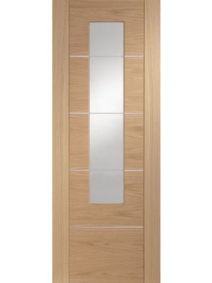 Elegant oak fire door featuring cross directional veneer, two vertical grooves and four silver strips in the centre. This fully finished door is available in a range of models including solid non-fire version and clear glazed version with central vision panel.